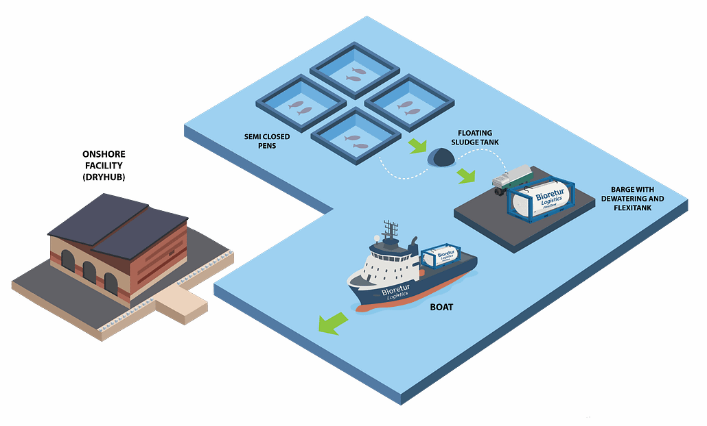 An example of Bioretur’s integrated solution for semi-closed sea-based farming systems, where sludge is collected in the sea, dewatered on a barge, and transported to shore for drying and further utilisation.